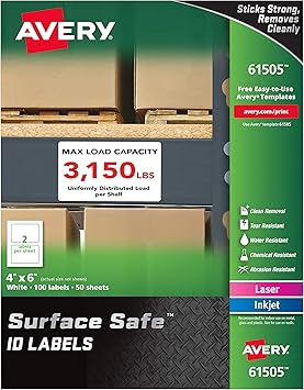 AVERY Surface Safe Durable ID Labels, Removable Adhesive, Water Resistant, 4" x 6", 100 Labels (61505), White